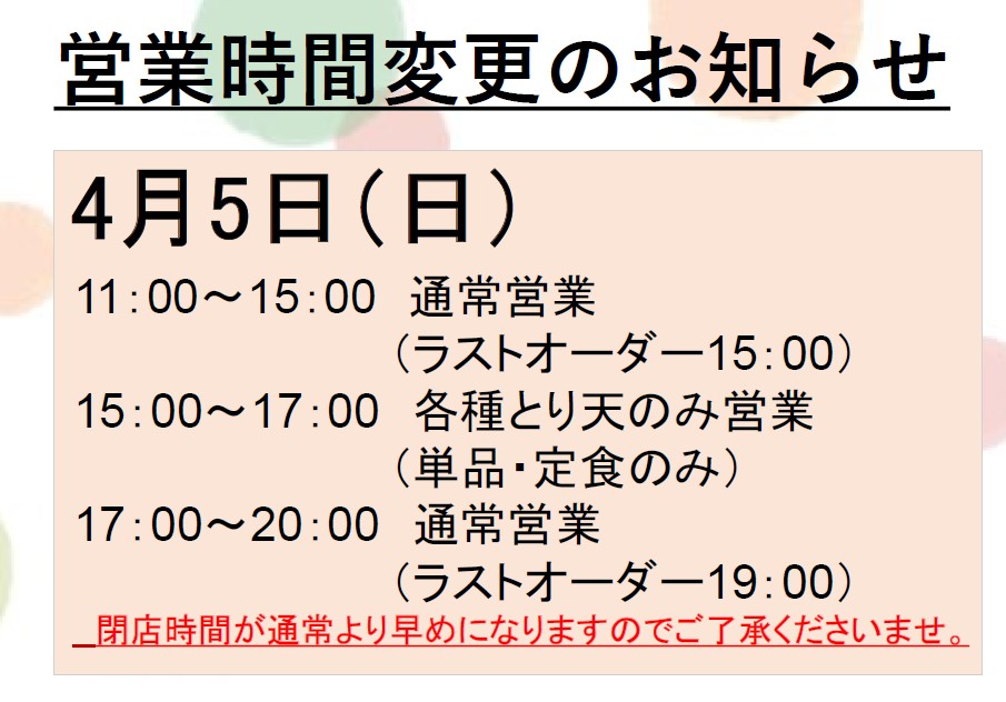通常よりラストオーダー・閉店時間が早まりますのでご注意ください。