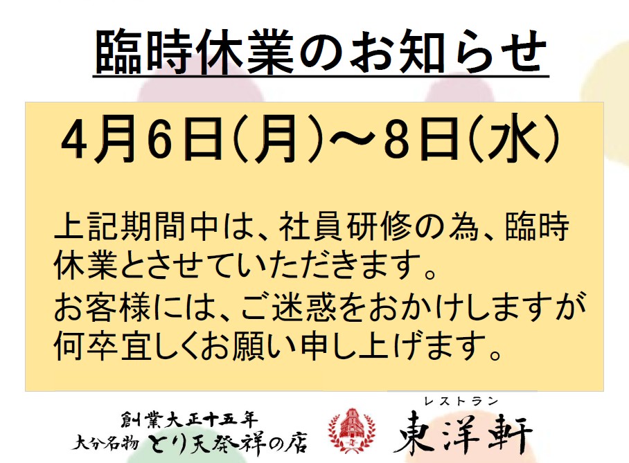2026年4月6日(月)~8日(水)は、社員研修の為、臨時休業とさせていただきます。